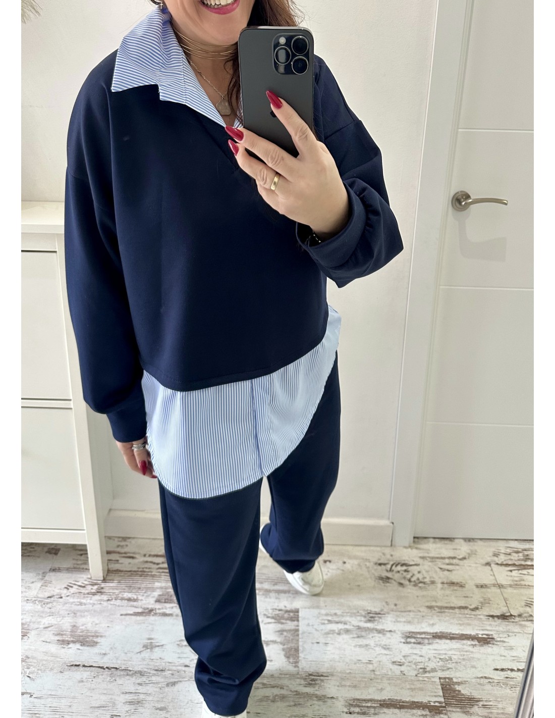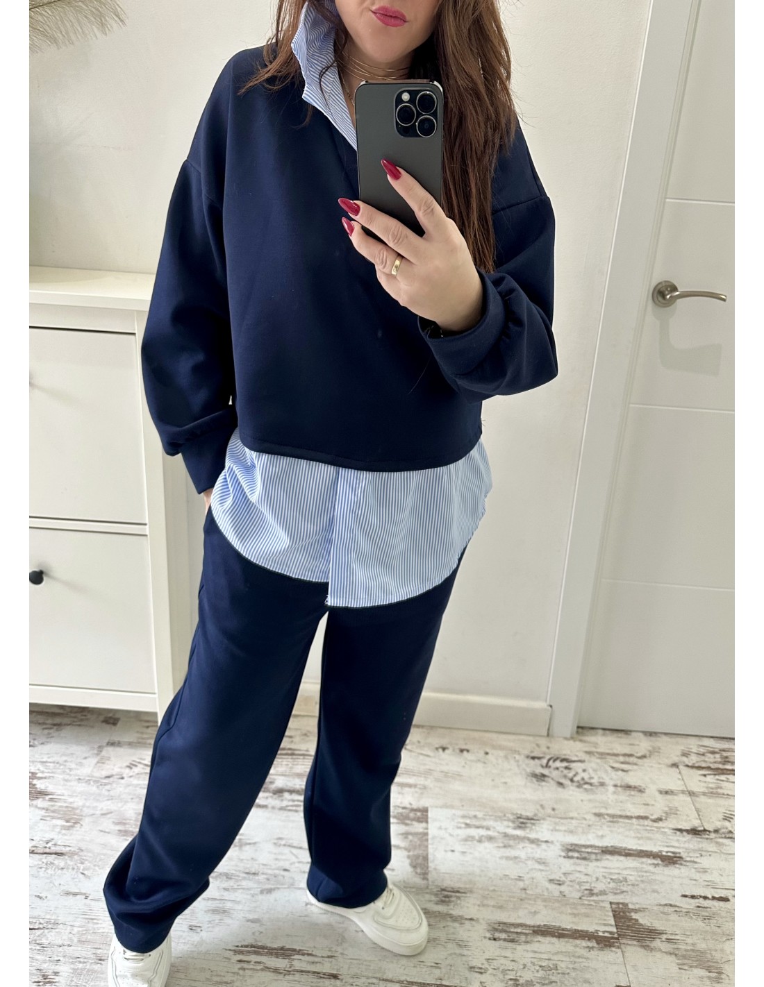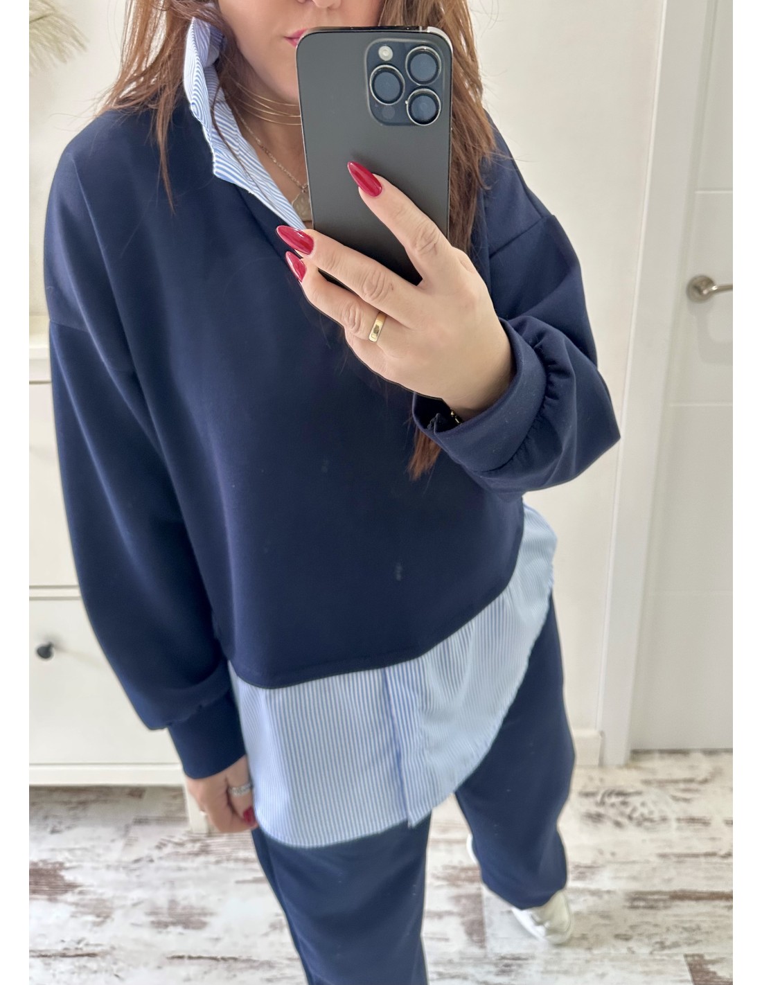 Sudadera mangas largas con detalle falsa camisa rayas.