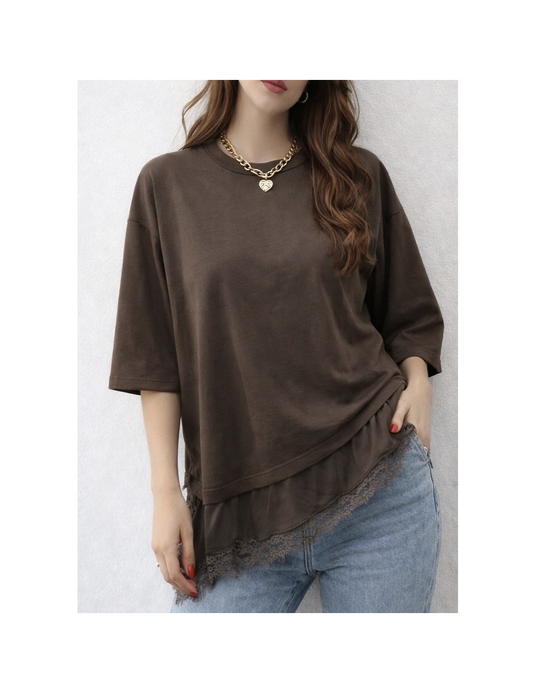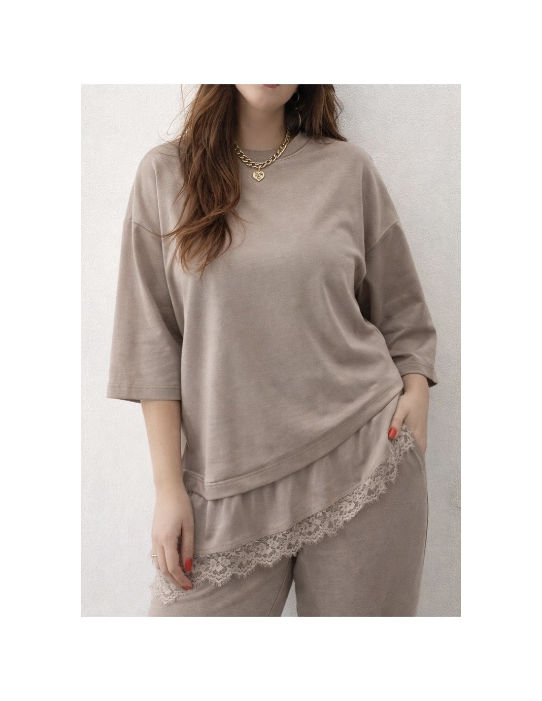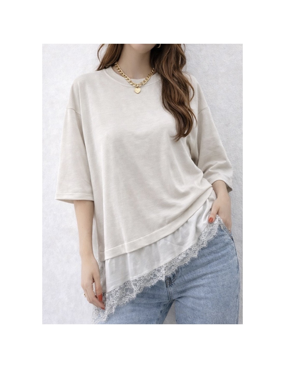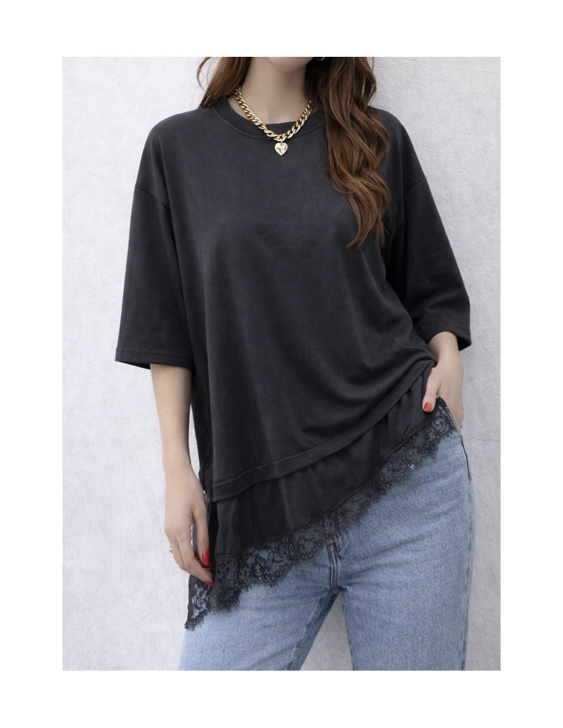Detalle de bajo satinado con encaje, forma asimetrica.