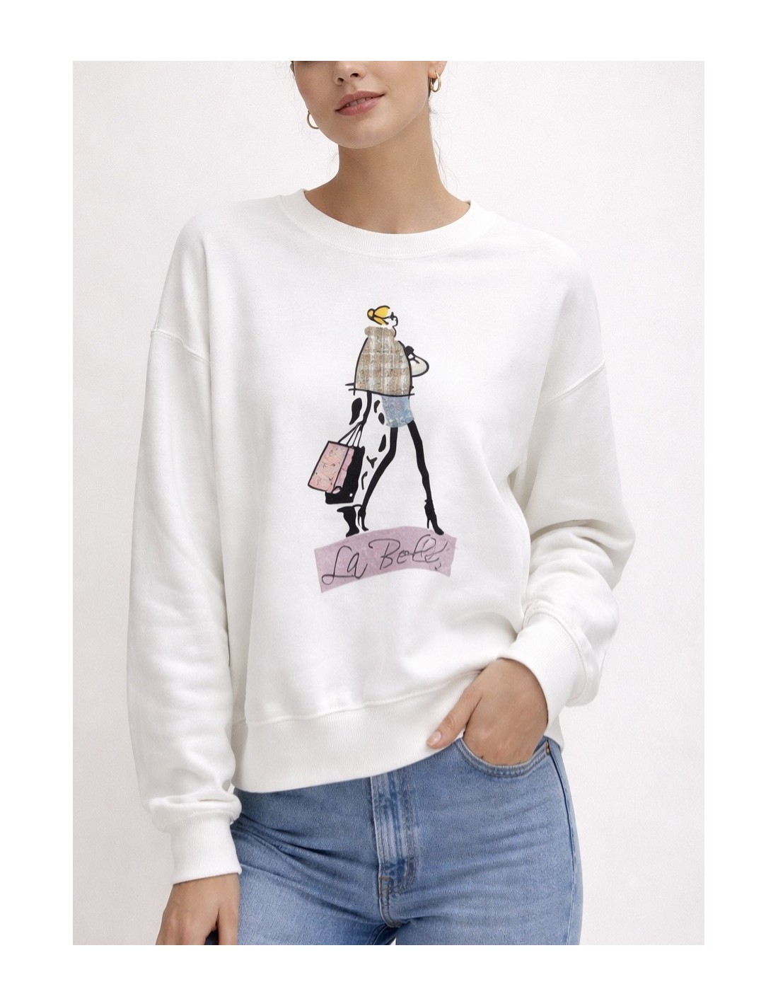 Sudadera con dibujo y detalle de tejido diferente en la muñeca.
